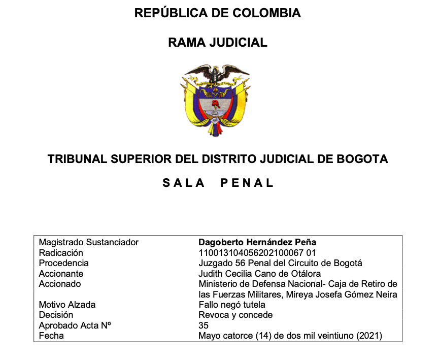 Tribunal de la Sala Penal – Fallo a favor de nuestra apoderada en contra las fuerzas militares